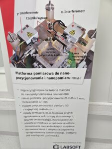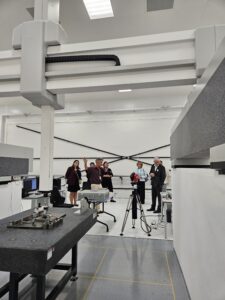 Dr Jacek Świderski zaprezentował możliwości Laboratorium Długości, m.in. zaawansowane stanowiska pomiarowe wykorzystywane w metrologii geodezyjnej. Uczestnicy poznali działanie stanowiska z laser trackerem – urządzeniem umożliwiającym precyzyjne śledzenie położenia obiektów w przestrzeni 3D – oraz maszyn do nanopomiarów, które pozwalają na analizę z dokładnością rzędu nanometrów. Te technologie są kluczowe w nowoczesnym przemyśle, inżynierii i badaniach naukowych.