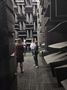 Szczególne wrażenie zrobiła wizyta w Laboratorium Akustyki, gdzie uczestnicy zwiedzili komorę bezechową – przestrzeń całkowicie pochłaniającą dźwięk, wykorzystywaną m.in. do kalibracji mikrofonów i badań emisji akustycznej. To miejsce, w którym cisza staje się narzędziem nauki.
